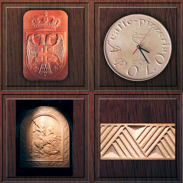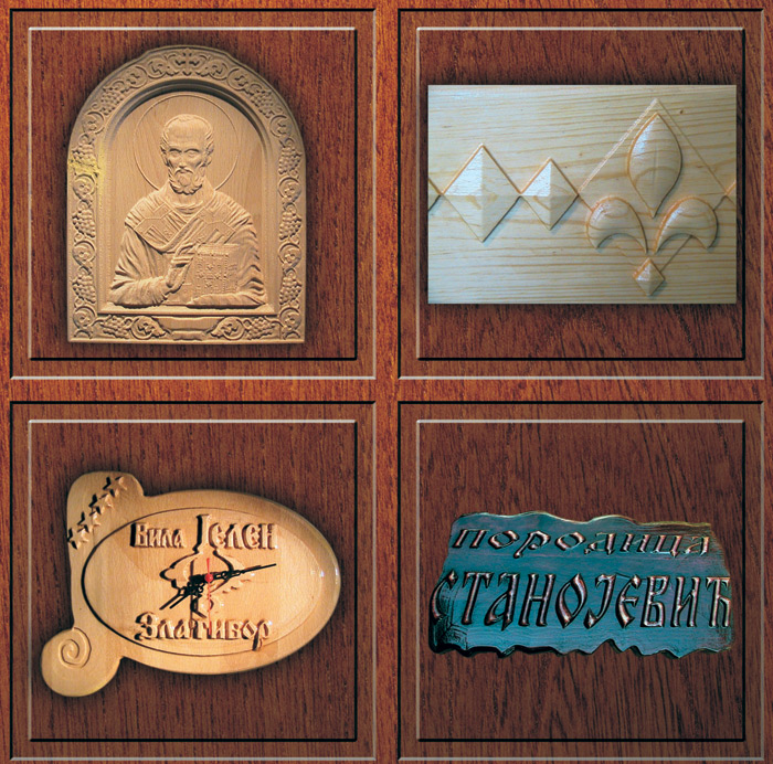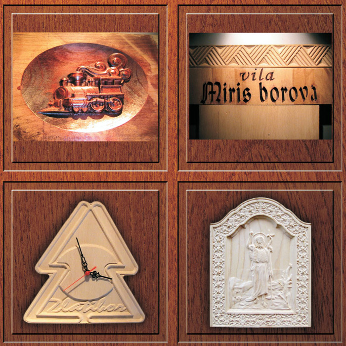 Rezbarenjem i obradom drveta do najsitnijih detalja omogućava se izrada unikatnih trodimenzionalnih modela – grbova, natpisnih tabli, ikona, satova, ramova itd.
