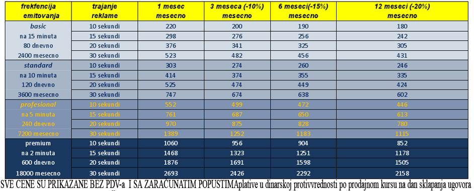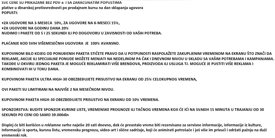 Budite sponzor kursne liste, vremenske prognoze ili tačnog vremena koji će ići NA SVAKIH 15 MINUTA U TRAJANJU OD 30 SEKUNDI PO CENI OD SAMO 39.000 din.